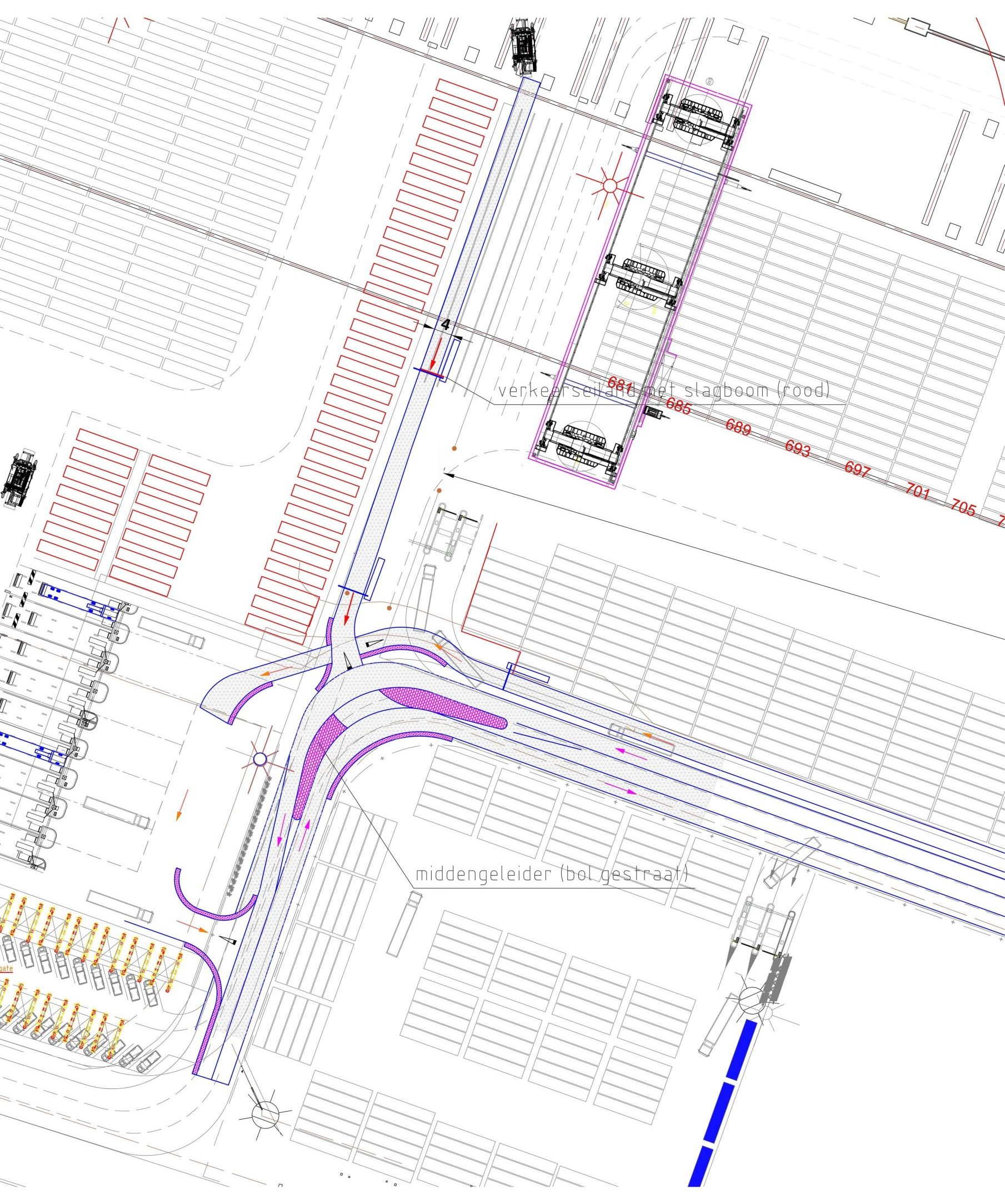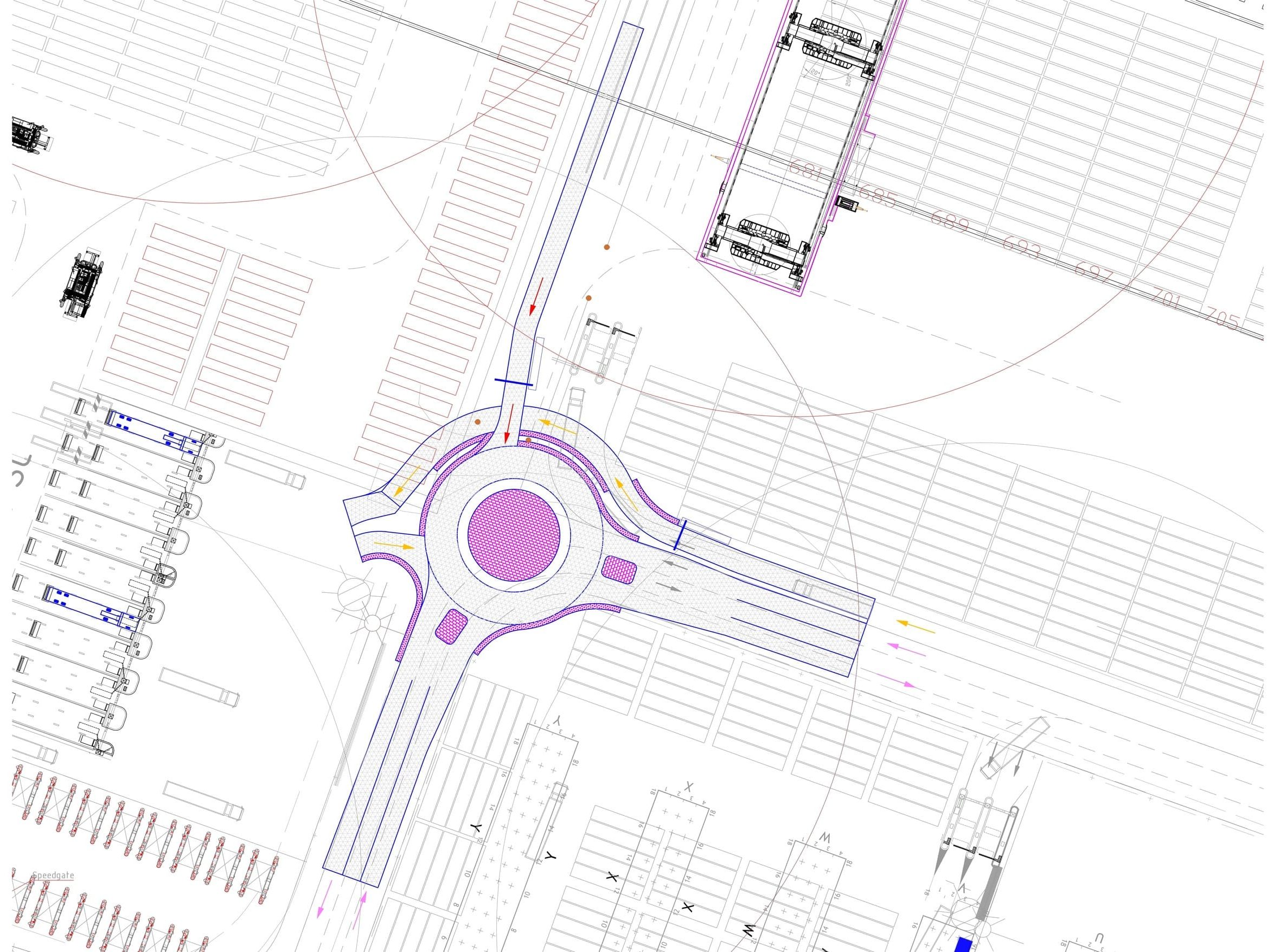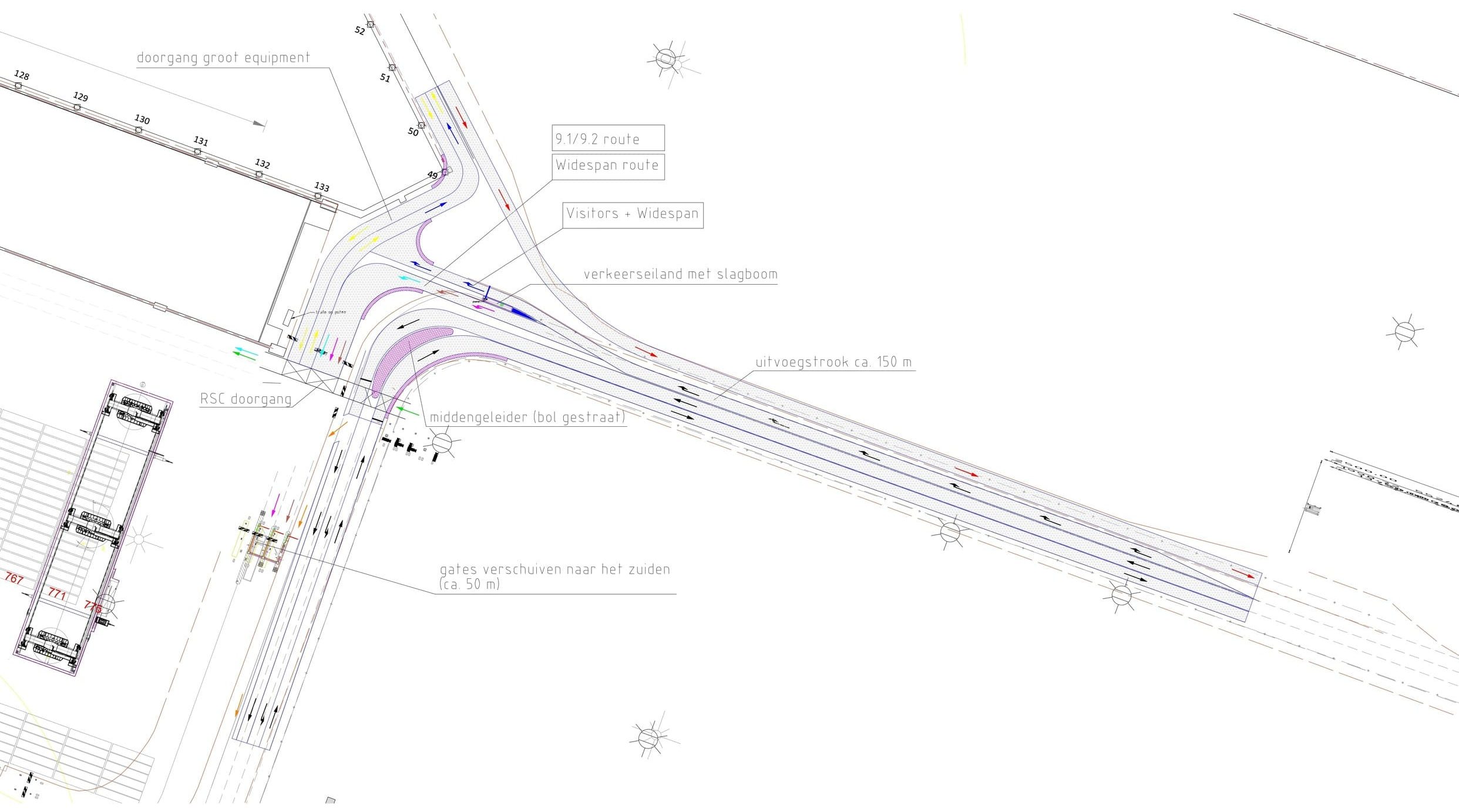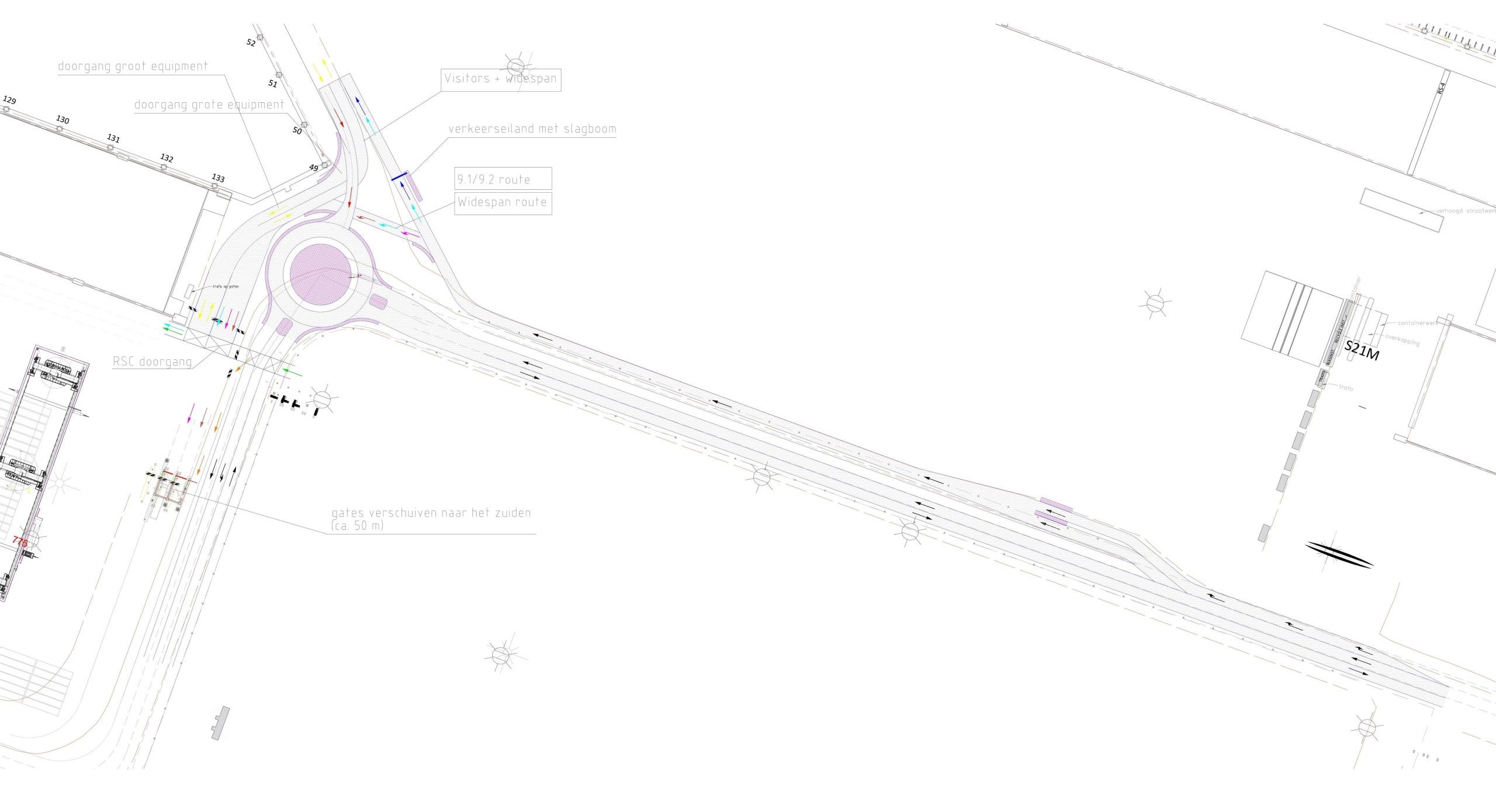We werkten voor beide prioritaire knelpunten verkeerstechnische varianten uit. Bij deze uitwerking hield het bureau rekening met de bestaande verkeersstromen, de beschikbare ruimte op het terrein en de wens om de afname van stack- en opslagcapaciteit te beperken. We toetsten de ontwerpen aan boogstralen volgens de ASVV en vulden deze toets aan met rijcurve-simulaties om de praktische uitvoerbaarheid te beoordelen. Daarnaast betrok het bureau incidenteel zwaar transport bij de analyse, zoals Straddle Carriers die jaarlijks voor onderhoud worden ingezet.